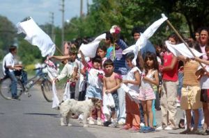 En el camino, a la altura de 7 y 630, donde se encuentra un barrio que lleva el nombre “San Carlos” en honor a Cajade, que nació gracias al cura y funciona un comedor comunitario de la Obra, chicos y grandes esperaron el paso del cortejo con flores y banderas blancas para saludar al querido Padre.