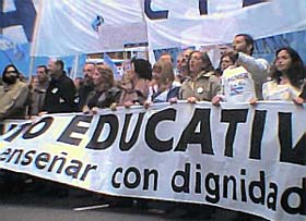 Los maestros reclaman la sanción de una ley que asegure una inversión educativa en el país equivalente al seis por ciento del Producto Bruto Interno, la derogación de la Ley de Federal Educación, la eliminación de los adicionales en negro y el establecimiento de un piso salarial uniforme en todas las provincias.