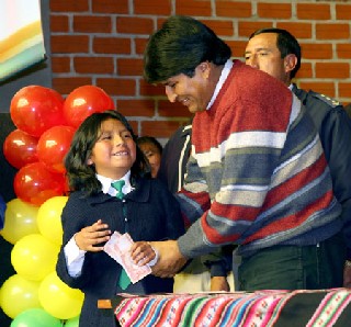 El presidente Evo Morales inauguró la entrega del bono “Juancito Pinto” el cual beneficiará a más de un millón de escolares. El financiamiento proviene de los ingresos petroleros.