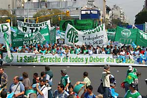 Luego le tocó el turno a los bonaerenses. Oscar de Isasi, dirigente de ATE de la provincia de Buenos Aires, planteó que “hoy venimos a caminar junto a los compañeros de toda nuestra patria a decirle no al Plan Federal de Salud, que es el negocio de la enfermedad”. Y agregó que “defender la salud es defender la dignidad del trabajador pero también es defender la prestación para el que más lo necesita. Y es pelear para que tanto el gobierno provincial como el nacional, que hoy están sentados en sendos colchones de plata, redistribuyan el ingreso, resuelvan la emergencia alimentaria y entonces sí ataquen las causas de la enfermedad”.