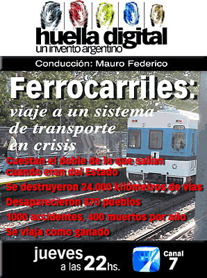 "Los periodistas, trabajadores de prensa de Canal 7, queremos denunciar y repudiar un nuevo hecho de censura en el canal público por el que se impidió en el día de ayer la salida al aire del programa Huella Digital, cuyo contenido abordaba la irregular situación de las empresas concesionarias de los ramales ferroviarios en la Argentina”, explicaba la comisión interna de la UTPBA-CTA del canal estatal en un comunicado de prensa enviado el pasado viernes, luego de que las autoridades informaran oficialmente la censura. Por otra parte, hoy se informó que, a pesar de la falta de promoción en las tandas del canal, el programa será emitido el jueves próximo, de acuerdo al compromiso asumido ante los periodistas por las autoridades del 7.