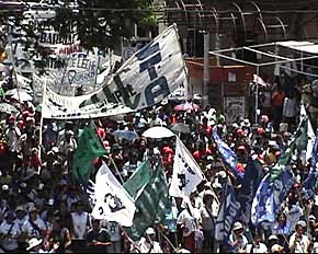 Pasadas las 13 horas de ayer, una multitudinaria marcha, encabezada por la Organización Barrial Tupac Amaru llegó a la Municipalidad de Jujuy para exigir al intendente Martiarena una asamblea pública a fin de que brinde explicaciones acerca del decreto que elevó el costo del boleto de colectivo a 90 centavos, a pesar de que fue invalidado por el Poder Judicial.