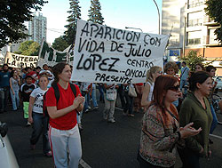 “Exigimos al Gobierno aparición con vida de Julio López”. Detrás de una bandera con esa consiga, casi 2.000 personas marcharon en la tarde-noche de ayer por las calles de la capital de la provincia de Buenos Aires, convocadas por la Multisectorial de La Plata, Besisso y Ensenada. La movilización partió de Plaza Italia y concluyó frente al edificio de la gobernación, sede del poder ejecutivo bonaerense. El poder político en todos sus niveles fue el principal destinatario de los reclamos de justicia.