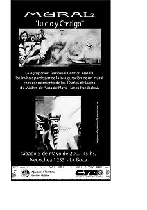 El sábado 5 de mayo en el barrio de La Boca se inaugurará un mural en homenaje a los 30 años de lucha de las Madres de Plaza de mayo-Línea Fundadora. El mismo fue creado y diseñado por Trizkelion, grupo de muralistas de la Agrupación Territorial Germán Abdala (ATGA-CTA). El acto tendrá lugar en la sede de la organización, en Necochea 1235, a las 15.