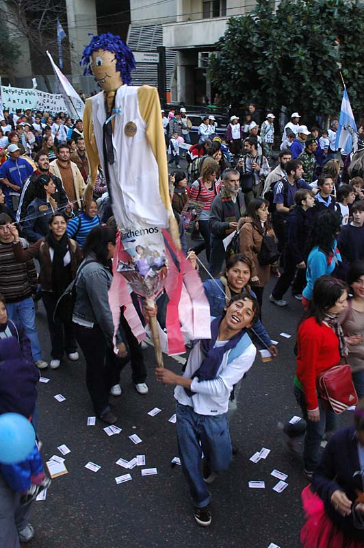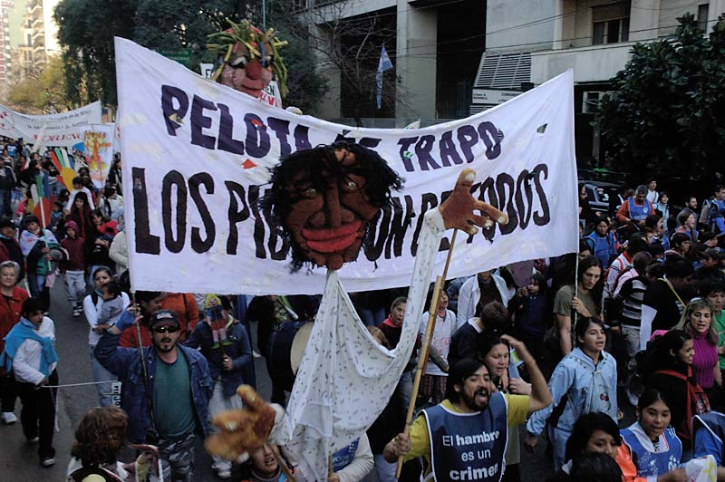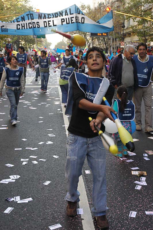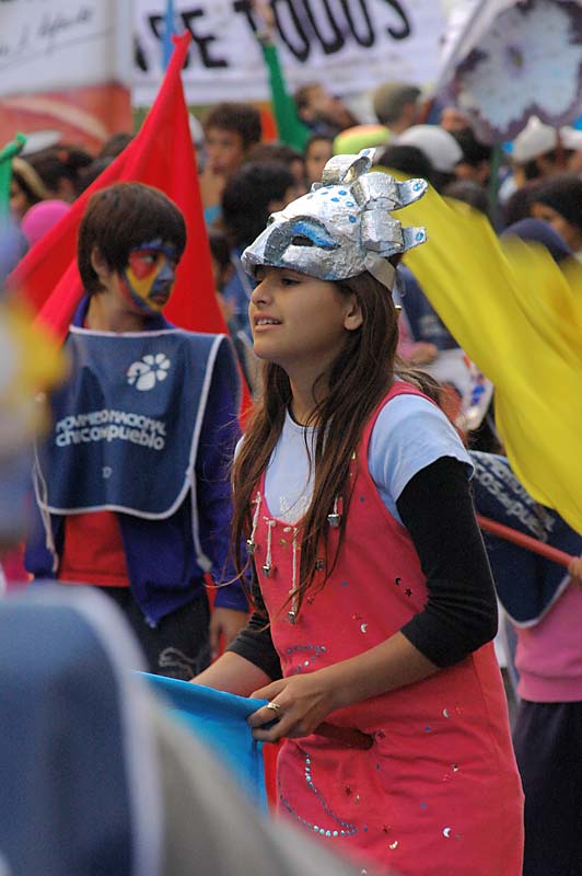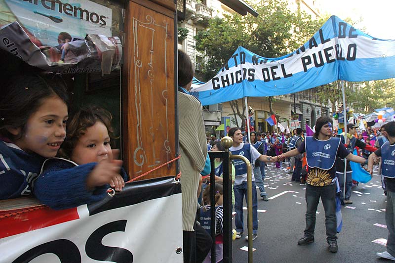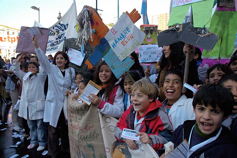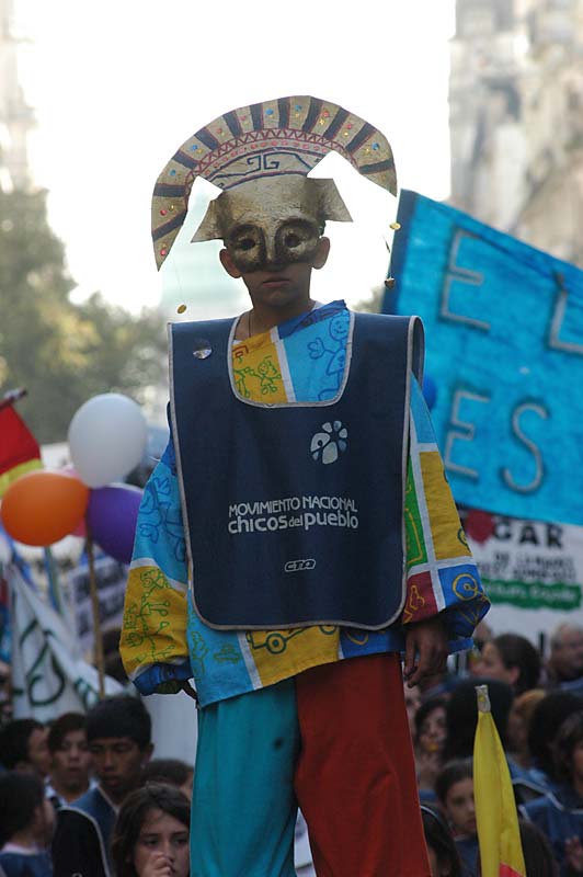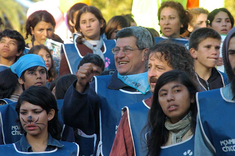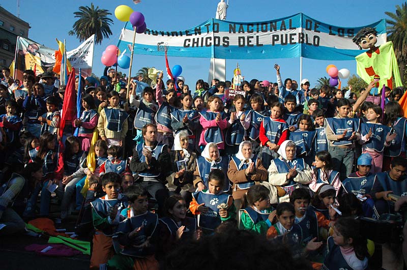 La plaza se llenó. El acto fue conducido por el periodista y escritor rosarino, militante de la CTA, Carlos Del Frade. Y el himno sonó. 12 gigantes muñecos llevaban las leyendas que los chicos recolectaron en su camino: “trabajo para mi papá; infancia es destino; diseñemos la nueva utopía; con ternura venceremos; el futuro es hoy; los niños no esperan”, fueron algunas de las consignas.