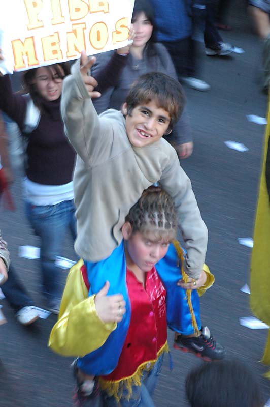 Sobre la ancha avenida 9 de Julio el río de niños se unió a la columna de la CTA. Y juntos caminaron esas cuatro cuadras hasta la plaza histórica. En la cabecera estaban ellos, los enanos, junto a las Madres de Plaza de Mayo de Santa Fe y de la Línea Fundadora; junto a Alberto Morlachetti, coordinador nacional del Movimiento y el secretario de Relaciones Institucionales de la CTA, Víctor De Gennaro, que los acompañó los 15 días de marcha. También se sumaron otros dirigentes de la Central a nivel nacional, de la provincia de Buenos Aires, y de la Capital Federal.