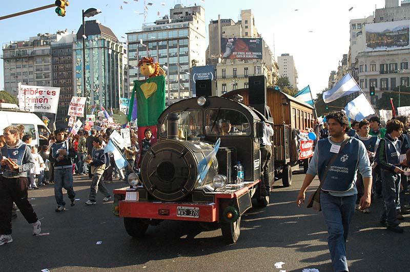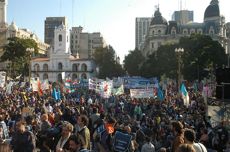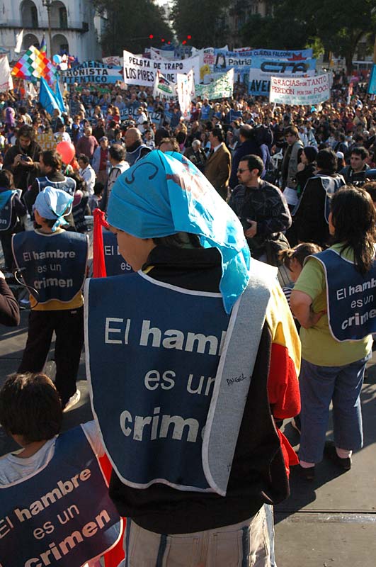 Cientos de banderas colmaron de color la Avenida Rivadavia primero y más tarde la Avenida de Mayo. A las 11 de la mañana llegaron al Parque Rivadavia, en el corazón de Caballito, el barrio de la clase media porteña. Comenzaron a caminar mientras veían como de a poco muchas otras voces y otros rostros empezaron a sumarse a ese río de caminantes. A saludarlos desde las veredas y los balcones. Muchos los vieron llegar a la Plaza Miserere, en Once, y preguntaron que hacían esos nenes “piqueteros” cortando la avenida. “Están pidiendo que se acabe la pobreza”, contestó una mujer mayor sentada en un banco de la plaza.