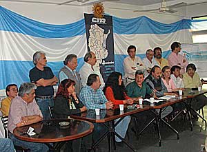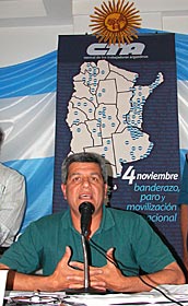 Un mapa gigante de la República Argentina hacía de telón de fondo de la rueda de prensa que una treintena de dirigentes de la CTA brindó hoy a las 15 en un salón del Hotel de la Asociación de Trabajadores del Estado, en el barrio porteño de San Telmo. Sobre el Océano Atlántico se leía “4 de noviembre: Banderazo, Paro y Movilización Nacional”. 200 círculos con la bandera nacional, distribuidos en cada una de las provincias, daban noción de la magnitud de la convocatoria. La presencia de los máximos representantes de la organización gremial, revelaban el compromiso.