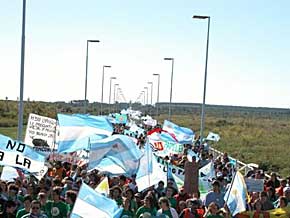 Unas 100 mil personas marcharon ayer 30 de abril hacia el puente internacional que une las ciudades de Gualeguaychú y Fray Bentos, para decir "Sí a la vida, No a las papeleras". La movilización, convocada por la Asamblea Ciudadana de Gualeguaychú, se realizó al cumplirse un año del primer corte total del puente. Hoy, todavía no hay respuesta a los reclamos contra la contaminación y la papelera de la empresa finlandesa Botnia sigue en construcción. Los trabajadores de la CTA, que llegaron de distintas partes del país, participaron activamente.