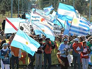 La uruguaya Julia Cócaro, ambientalista de Fray Bentos, integrante de Movitdes, Movimiento por la vida, el trabajo y un Desarrollo Sustentable, también desplegaba su bandera uruguaya. “Nos dicen desde el gobierno uruguayo que si las papeleras contaminan, las cerraran, pero los ambientalistas sabemos que cuando se abre una papelera, no la cierra nadie”, manifestó Cócaro y agregó: “Nosotros sabemos que como pequeño país no podemos aceptar la instalación de 8 papeleras que son las que prevén después de estas. Habría que hacer un estudio de cuenca serio, el único país que lo hace es Sudáfrica, que foresta lo que la cuenca permite, ni un árbol más. Las tierras que se están forestando van camino a la desertificación. Es que el problema de Uruguay, es común al de Argentina: los ganaderos no encuentran predios para la ganadería. En los últimos 20 años abandonaron el campo unos 42.000 pequeños y medianos productores. De esta manera, se quiebra con la identidad y se genera marginalidad porque esos pequeños productores van a engrosar los cinturones de pobreza de las ciudades”.