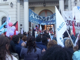 Con un cerrado aplauso, los docentes respondieron al anuncio con que se arrancó el acto: el nivel de acatamiento al paro se ubicó en el 93% en toda la provincia, echando por tierra las especulaciones oficiales que suponían una caída en el impacto de la medida tras haber practicado los descuentos sobre los salarios docentes por paros cumplidos en el mes de julio.