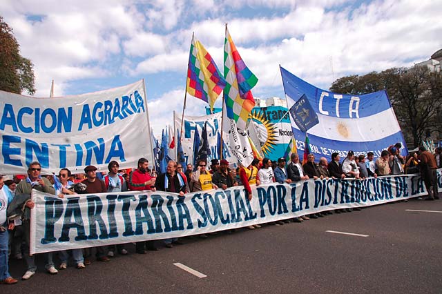 Miles de trabajadores y trabajadoras agrupados en las distintas organizaciones de la CTA, junto a integrantes de la Federación Agraria Argentina, de la Asamblea de Pequeños y Medianos Empresarios y de distintas organizaciones sociales y territoriales, marcharon este mediodía por las calles de la Capital Federal para exigir una “inmediata y justa distribución de la riqueza”. Paritaria Social YA, fue la consigna que se hizo sentir a lo largo y ancho de todo el país.