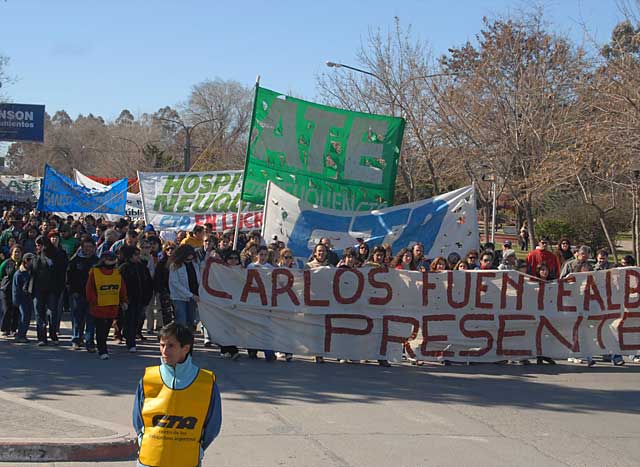 Por su parte, los trabajadores y trabajadoras de la CTA Neuquén concretaron hoy un paro de 24 horas con movilización en la ciudad capital. Una formidable columna estimada en más de 6.000 trabajadores, luego de concentrarse en el Monumento a San Martin cubrió varias cuadras del centro neuquino. Frente al Juzgado Penal, Sandra Rodríguez, compañera de Carlos Fuentealba, solicitó que “se unifiquen los procesos seguidos a Poblete con la investigación encarada sobre los responsables políticos e ideológicos del plan de represión que derivara en el asesinato de su compañero”.