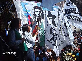 Previo al acto, la marcha conducida por la CTA se detuvo en la Secretaría de Derechos Humanos de la Municipalidad para expresar el repudio contra el ataque sufrido por la familia del dirigente social Carlos “Perro” Santillán, debido a que ayer fue secuestrada su hija y luego liberada sin que se haya esclarecido el hecho.