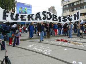 Los manifestantes se reunieron frente al hotel y cortaron el tránsito, con pancartas que hacían juego con los eslóganes de la campaña publicitaria de televisión de Sobisch: “Sobisch, 100% asesino, 100% preparado para manchar las tizas con sangre”.