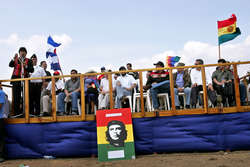 En medio de un fuerte viento que hacía flamear centenares de banderas de distintos países, el Primer Mandatario aseguró que “este viento tan fuerte, veloz e imparable, así será la revolución democrática, imparable en Latinoamérica hasta acabar con el sistema capitalista”.