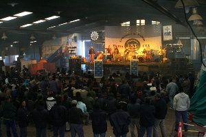 Mario Barrios, como Secretario General de la Asociación Nacional de Trabajadores Autogestionados (ANTA-CTA) y Presidente de la UST, es el encargado de abrir la jornada. Desde el escenario - un semi de la UST ya veterano en el mundo artístico: por él han pasado Teresa Parodi, la Orquesta Juan de Dios Filiberto, Raly Barrionuevo, Verónica Condomí, Bruno Arias, Zamacuco - Mario señala la enorme pila de alimentos que se ha ido juntando en una esquina del galpón. -“Los compañeros tobas no necesitan que les mandemos harina, azúcar, yerba”- dice. -“Esto no es nada más que un gesto simbólico, una excusa para que cada uno de ustedes se sienta parte. Lo que los compañeros necesitan es saber que pueden contar con nosotros, que vamos a estar juntos para luchar juntos por la vida que nos merecemos”.