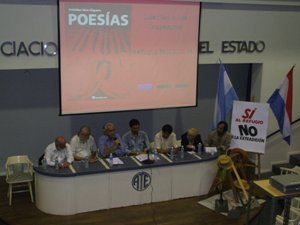 En el marco de acciones previstas a favor del otorgamiento de refugio político y en contra la extradición de los seis campesinos paraguayos detenidos en Argentina, acusados de un crimen del que no existen pruebas, el pasado viernes 19 se realizó en la sede de ATE Nacional, en la Capital Federal, la proyección del documental "No a la Extradición" y la presentación del libro "Poesías", escrito en la cárcel por Arístides Vera, uno de los lideres campesinos detenidos en penal de alta seguridad de Marcos Paz.