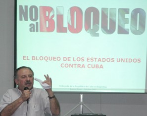 Unas 300 personas participaron hoy del acto solidario que tuvo lugar en la sede nacional de la CTA. Representantes de la Embajada de Cuba y Venezuela en la Argentina y de la CTA se dieron cita para expresar el más enérgico repudio contra el brutal bloqueo contra la Isla y las declaraciones del presidente de los Estados Unidos, George W. Bush. A las 17 se inició el evento con la proyección del documental “Desafío”. Este conmovedor film del realizador cubano Roberto Chile muestra la heroica lucha del pueblo cubano para enfrentar el bloqueo comercial, económico y financiero de los Estados Unidos. Posteriormente, Fuente Hernández, presentó un video y disertó sobre la historia de esa política genocida de Washington. La presentación del embajador puede verse en su totalidad en la página web www.cubavsbloqueo.cu.