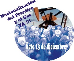 El próximo 13 de diciembre, fecha del Centenario del Petróleo Nacional, se ha invitado y convocado a todas las organizaciones populares, gremiales, estudiantiles, agrarias, sociales, políticas, al Acto de Reivindicación Soberana y por la Nacionalización de los Recursos Petrogasíferos Ya!!!