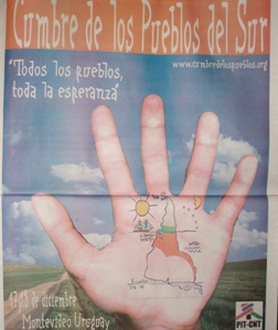 Por Rosario Barrenechea, enviada especial. La Cumbre de los Pueblos del Sur se desarrolló en Montevideo el 17 y 18 de diciembre, en paralelo a la Cumbre Sindical del Cono Sur y de la Reunión de Presidentes del Mercosur. En la misma se presentaron paneles donde se expuso la situación latinoamericana en diversos aspectos de la integración regional desde la perspectiva de la organizaciones sociales, con la masiva presencia de comitivas regionales como PIT-CNT, Alianza Social Continental, MOSIP, ATTAC, SERPAJ, Foro de la Triple Frontera, Cono Sur Sustentable, REBRIP Brasil, Iniciativa Paraguaya y CTA, entre otros.