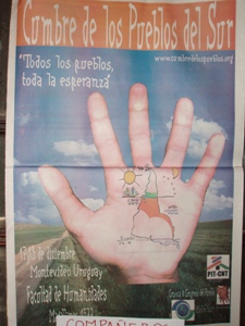 Montevideo fue el escenario en donde movimientos sociales de la región se reunieron el 17 y 18 de diciembre. En la Facultad de Humanidades y Ciencias de la Educación y bajo la consigna "Todos los pueblos, toda la esperanza" se realizaron 14 paneles de debate. Unos 700 participantes asistieron a estos talleres que incluyeron temas tales como: la integración y los tratados de libre comercio; desmilitarización y derechos humanos; energía y recursos naturales; redistribución de la riqueza; medioambiente; comunicación alternativa; y otras actividades artísticas y culturales. En tanto que en el paraninfo de la Universidad de la República, representantes de las 9 organizaciones gremiales que integran la Coordinadora de Centrales Sindicales del Cono Sur (CCSCS) debatieron y lanzaron la “Campaña Trabajo y Salario Dignos en el Mercosur".
