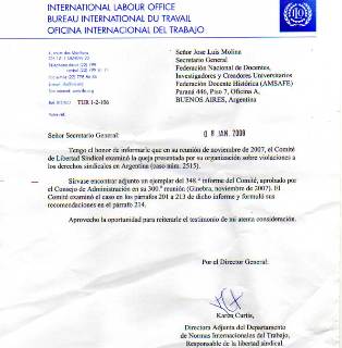 En una misiva enviada con fecha 8 de enero a José Luis Molina, secretario general de la Conadu Histórica, y firmada por Karen Curtis, directora adjunta del Departamento de Normas del Trabajo, Responsable de la Libertad Sindical, en la que le informa que se tomó nota de la queja presentada por la organización gremial y le adjunta el informe del Comité en el que “pide al Gobierno que en consulta con los representantes de los trabajadores y de los empleadores tome las medidas necesarias para modificar el artículo 28 de la ley, que requiere para poder disputar la personería gremial a otra asociación, que la asociación demandante posea una cantidad de afiliados «considerablemente superior» y el artículo 21 del decreto reglamentario núm. 467/88 que califica el término «considerablemente superior» al establecer que la asociación que pretenda la personería gremial deberá superar a la que la posea como mínimo en un 10 por ciento de sus afiliados cotizantes”.