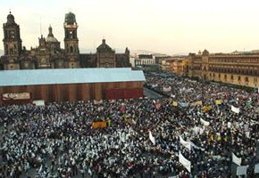 El punto de concentración de la movilización campesina fue la plaza del Zócalo, en Ciudad de México. Rodeados por un gran cerco policial, los manifestantes, montados en sus tractores, protestaron contra la liberación del mercado del de maíz impuesta por el TLCAN.