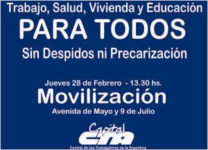 La convocatoria es para el jueves 28 de febrero, a las 13.30 en la esquina de Avenida de Mayo y 9 de Julio. Desde allí, el conjunto de organizaciones que componen la CTA Capital, marchará hacia la Jefatura de Gobierno, bajo las consignas de: “sin despidos ni precarización” y “no al cierre de programas sociales y educativos”.