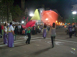 Al son de los tambores, con su suave cadencia, banderines de colores comenzaron su andar mientras, a los costados las brujas prendían sus velas, simbolizando el fuego de sus vidas y las de tantas otras mujeres, presentes y ausentes. En silencio las brujas avanzaban siguiendo los tambores, mientras el viento travieso, como los tropezones de la vida, amagaba por apagar las velas, pero aún cuando lo lograba, una mano solidaria se tendía y la vela recuperaba su vida. Algunas brujas bajaban su vela y otras las alentaban “dale levantala, no tengas miedo, no se apagará y si se apaga la volvemos a prender!”