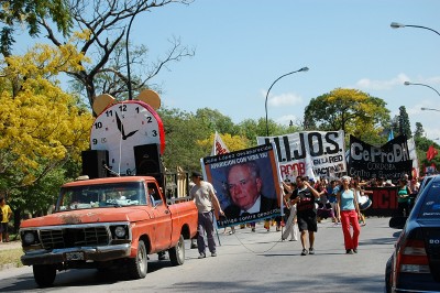 Una carroza con un enorme despertador ilustrado con un retrato de Luciano Benjamín Menéndez fue la síntesis del “escrache” frente a los Tribunales Federales de Córdoba, en reclamo de “cárcel común perpetua y efectiva” para los represores del Proceso militar y repudio a la “Justicia cómplice”.