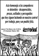La Juventud de la CTA Capital realizará, el próximo 27 de marzo a las 18.30, en la sede de la CTA Nacional (Piedras 1065) un acto en homenaje a todos aquellos compañeros que fueron perseguidos, presos, que estuvieron detenidos en centros clandestinos o se tuvieron que exiliar y que hoy continúan militando en la Central.