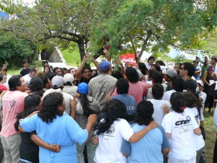 Como todos los barrios de esta organización hay un quincho con una pileta enorme, vemos a las compañeras al lado del fuego cocinando con calor y humedad extrema. Me acerco tímidamente hasta que María Esther me estrecha en un abrazo, y empieza la charla…mientras que en el quincho el resto de los cumpas cuentan su experiencia, los laburos militantes que se vienen realizando…todos en ronda, con Api en mano y buñuelos de anís escuchábamos los relatos que nos hicieron llorar a todos…pero llorar de alegría, de saber que es posible, que la concreción de los sueños no es sólo una utopía sino que puede ser real.