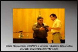 En un marco de profundo compromiso por parte de quienes conforman el MORENO, se entregó el “Reconocimiento MORENO” al compañero Alberto Morlachetti, de la Fundación Chicos del Pueblo, a la Central de Trabajadores de la Argentina, a la Federación Agraria Argentina, al abogado David Patricio Romero y a Hipólito Solari Irigoyen; personalidades e instituciones que se destacaron en su esfuerzo, participación, y lucha por la defensa del patrimonio nacional.