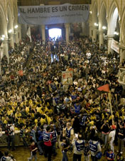 Era una iglesia distinta claro: banderas rojinegras ondeando cerca del altar (Sandino, Kropotkin y todos esos santos revolucionarios). Arriba, en los más alto, una pancarta decía “Movimiento Chicos del Pueblo”. Después, en otro momento, otra pancarta decía “El hambre no es voluntad de Dios”.
