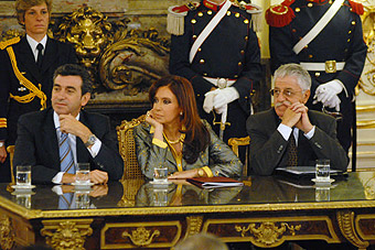 El secretario adjunto de la CTA, Pedro Wasiejko, junto con Stella Maldonado de CTERA; Francisco Tito Nenna, de UTE y Roberto Baradel, de SUTEBA, participaron del lanzamiento del Plan FinEs que realizó ayer a la mañana el ministro de Educación, Juan Carlos Tedesco, junto con la presidenta Cristina Fernández de Kirchner, en Casa de Gobierno.