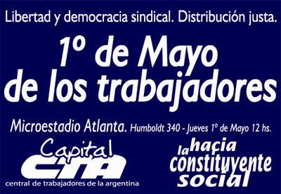 En este 1º de Mayo, fecha ícono de los trabajadores, la CTA Capital exige una vez más Libertad y Democracia Sindical, una justa Distribución de la Riqueza, soberanía energética, ningún hogar por debajo de la línea de pobreza y acceso a la salud y educación para todos.