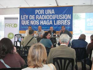 “Cuando nadie hablaba de la necesidad de una nueva ley, cuando se mantenía en silencio… Silencio de los grandes medios que no hablan de esto, que silencian este tema desde hace muchos años” arrancó diciendo Néstor Busso, Secretario del Foro Argentino de Radios Comunitarias (FARCO), que actuó como moderador de las charlas que se sucedieron durante toda la tarde y que se transmitieron en vivo vía satélite desde FARCO y ALER para toda América Latina.
