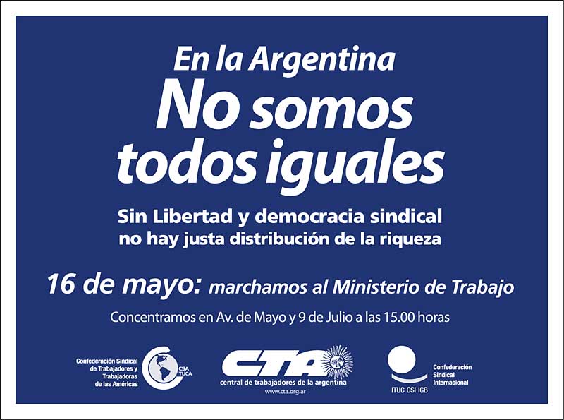 Y concluyó: “Si se pudiera encontrar un ámbito para discutir la agenda que la Argentina reclama, la CTA iría, aún con la negativa que significa seguir dilatando la respuesta a nuestro pedido de personería gremial, con un mandato claro: iríamos a decir que el principal problema de nuestro país no es la deuda con el Club de París o asegurar la rentabilidad infinita a los empresarios de la ciudad o del campo, el principal problema es la desigualdad social. Argentina merece mucho más y por eso seguimos luchando”.