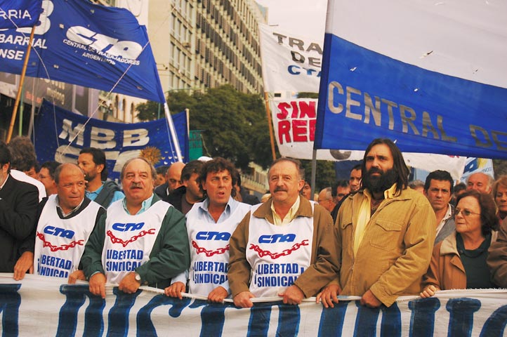 La inmensa esquina de Avenida de Mayo y 9 de Julio comenzó a poblarse a las tres de la tarde. De a poco iban llegando trabajadores de las distintas organizaciones que componen la CTA y las delegaciones de la Central de provincias como Santa Fe, Entre Ríos y La Pampa, junto a los militantes del conurbano bonaerense y de los barrios porteños. Alrededor de las cuatro de la tarde, la columna comenzó a avanzar hacia el Obelisco encabezada por los representantes de la conducción nacional, junto a los de las organizaciones sindicales y territoriales de la ciudad y el conurbano, y los titulares de distintas delegaciones del interior del país. Muchos de ellos, junto a los trabajadores y trabajadoras gastronómicos y del sector privado, llevaban unas pecheras blancas con la consigna que resume este viejo reclamo de la CTA: “Libertad sindical YA”.