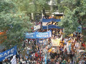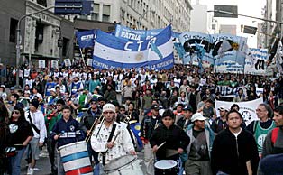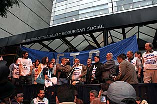 Las cinco cuadras de la nutrida columna recorrieron la avenida Corrientes. El bullicio y los colores de las banderas suplantaron por unos minutos las marquesinas de teatros y locales comerciales. La tarde empezaba a caer y frente a la cartera laboral comenzó el acto central de la jornada, que también tuvo otras actividades en ciudades del interior del país. Fue Hugo Yasky, secretario general de la CTA, el encargado de sintetizar en su discurso el reclamo de la Central. Luego de saludar a Jorge Raúl González, quien estuvo secuestrado dos días y fue amenazado y torturado en la localidad bonaerense de Florencio Varela, el titular de la Central exclamó: “Le decimos a los que se lo llevaron que no nos van a parar. Estamos de pie y no vamos a aflojar en la pelea. Por eso van a seguir los juicios por la verdad, los juicios contra la impunidad. Y vamos a seguir pidiendo que el responsable intelectual del asesinato de nuestro compañero Fuentealba, Jorge Sobisch, esté preso”.