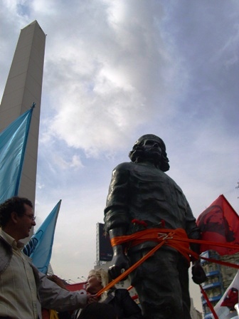 Así, la escultura, de unos 4 metros de alto, recorrió la Ciudad Autónoma de Buenos Aires subido en un camión, escoltado por integrantes de la Asociación Nacional de Trabajadores Autogestionados (ANTA-CTA), que cuidaban las cuerdas con las que se la sostenía. En su paseo –que incluyó paradas en varias intersecciones- fue saludado por cientos de manifestantes en las esquinas porteñas. Algunos espontáneos, otros convocados a través de correos electrónicos y carteles en las calles. También, varios motoqueros escoltaron el camino que trasladaba el monumento.
