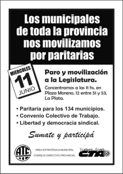 En una reunión del Consejo Directivo Provincial de ATE Buenos Aires, con presencia de todas sus seccionales y delegaciones, se resolvió convocar para el próximo miércoles 11 a una Jornada de Lucha de los Trabajadores Municipales con paro y movilización a la Legislatura.