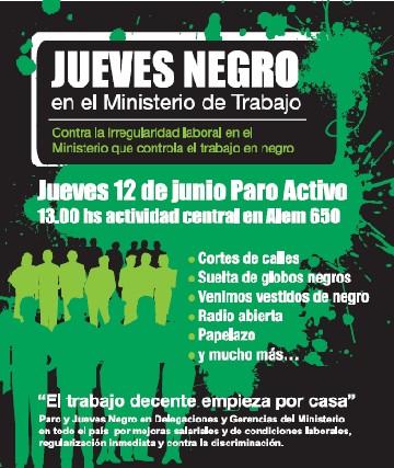 La actividad central del "Jueves Negro" será a las 13.00 en Leandro Além 650, Capital Federal, denunciando irregularidades laborales en la cartera que debe combatirlas.