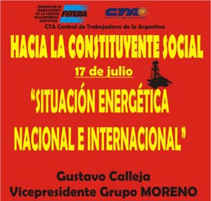 En el marco de la serie de charlas-debate denominadas: “Hacia la Constituyente Social. Qué modelo energético necesitamos” - que se llevan a cabo en la sede de la CTA Nacional, desde el 10 de julio, todos los jueves- el vicepresidente del Movimiento por la Recuperación de la Energía Nacional Orientadora (Grupo Moreno), Gustavo Calleja, disertará esta semana sobre la situación energética nacional e internacional.