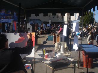 A la hora del almuerzo, un artista plástico se ubicó frente a un blanco lienzo y comenzó a dar las primeras pinceladas de color. Detrás, toda clase de pinturas y esculturas rodeaban un escenario montado delante de la fachada de la Escuela de Arte, que compartió el espacio con las producciones del Centro de Formación Profesional Nº 402. La radio se ubicó delante del cartelón de la Campaña “Cultura por los Pibes”, colgado de la pared de la Escuela.