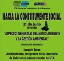 En el marco de la serie de charlas-debate denominadas: “Hacia la Constituyente Social. Qué modelo energético necesitamos” - que se llevan a cabo en la sede de la CTA Nacional, desde el 10 de julio, todos los jueves- el especialista en medio ambiente Joaquín Turco, disertará sobre aspectos generales del medio ambiente y la gestión ambiental.