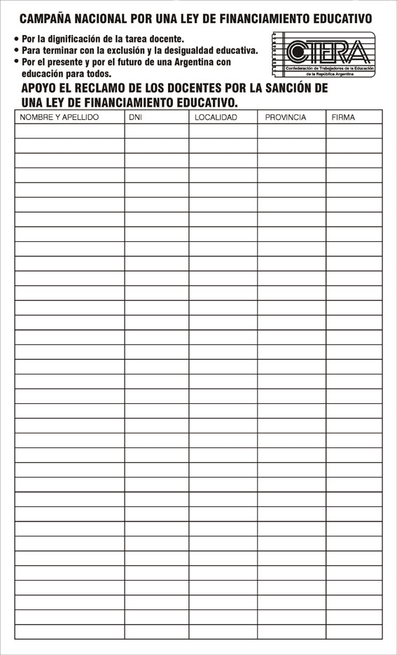 Desde la CTERA consideran que para lograr la dignificación del trabajo docente; terminar con la exclusión, la desigualdad y la deserción escolar; garantizar la escolaridad desde el jardín de infantes hasta la escuela secundaria; construir y mejorar los edificios escolares; contar con material didáctico, bibliotecas y recursos tecnológicos; y otorgar becas escolares para los alumnos de todos los niveles se necesitan una nueva ley de financiamiento educativo.