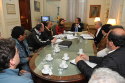 El gobernador, junto a la ministra de Asuntos Agrarios y Producción, Débora Giorgi y al presidente de ARS, Lelio González Eliçabe, recibió a los representantes de los trabajadores del Astillero, Vicente Ignomiriello, por ATE Ensenada y Carlos Leavi, por ATE Provincia, delegados de los trabajadores del Astillero y representantes del municipio de Ensenada.
