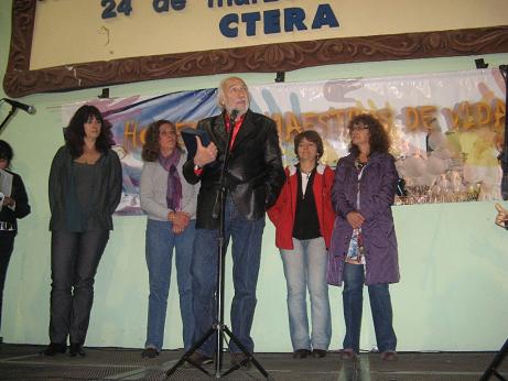 A continuación se recordó a tres personalidades muy queridas por los maestros, que fallecieron hace poco tiempo: Berta Braslavsky -pedagoga-, Norma Colombatto -Directora de una escuela de villa de Capital- y el pintor Pérez Celiz.